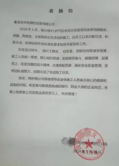 2018年5月18日,公司再次收到來自國電某發電廠的一封表揚信。信中,甲方對公司全體施工人員盡職盡責、積極主動、規范有序的態度和精神提出嘉許。信中提到:“在改造過程中,面對工期緊、任務重、受限空間等諸多因素,施工人員統一思想、精心組織管理,發揚艱苦奮斗、頑強拼搏、迎難而上、攻堅克難的戰斗精神,合理調配資源,強化安全質量管理、發揮團隊凝聚力,按期完成了各項施工任務?!?/FONT>