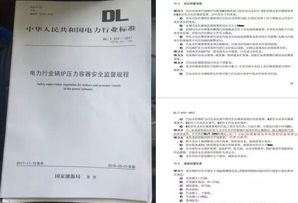 中華人民共和國電力行業(yè)標準《電力行業(yè)鍋爐壓力容器安全監(jiān)督規(guī)程》(DL/T 612-2017)(替代DL612-1996)于2017年11月15日由國家能源局發(fā)布,并于2018年3月1日實施。此規(guī)程規(guī)定了電力行業(yè)鍋爐壓力容器安全監(jiān)督要求,并在“10.安全保護裝置及儀表中10.3水位測量系統(tǒng)”引用了《火力發(fā)電廠鍋爐汽包水位測量系統(tǒng)技術(shù)規(guī)程》(DL/T1393-2014)部分內(nèi)容進行系統(tǒng)闡述。