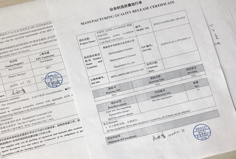 1月16日,華電測控供菲律賓GNPower Dinginin 2×660MW燃煤電廠14臺控制柜出廠發貨。設備出廠前經過上海電建設備監造部的現場檢驗,驗收合格予以放行出廠。這是繼2018年6月供GNPD項目1號機組7套煤倉疏松機設備、2019年3月供GNPD項目2號機組7套煤倉疏松機設備的第三批次供貨。