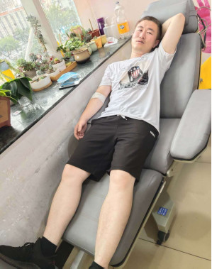 經過兩個多小時的漫長等待,下午五點多,血小板捐獻結束,程磊汗流浹背的走出獻血房間,圓滿的完成了本次任務。