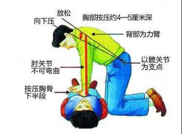 4.心肺復(fù)蘇:兩只手掌根重疊置于傷者胸骨中下1/3處,男性在兩乳頭連線中點。肘關(guān)節(jié)伸直,借助身體之重力向傷者脊柱方向按壓。按壓頻率100――120次/分。單人搶救時,每按壓30次,俯下做口對口人工呼吸2次(30:2)。雙人CPR時可采用15:2的比率。