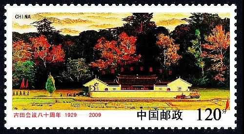 2009年12月28日上午,《古田會議八十周年》紀念郵票首發(fā)式在福建省龍巖市隆重舉行。福建省,中國郵政集團公司的領(lǐng)導,以及龍巖市四大班子領(lǐng)導、福建省郵政公司領(lǐng)導和嘉賓出席了郵票首發(fā)式,并為《古田會議八十周年》紀念郵票首發(fā)揭幕。《古田會議八十周年》紀念郵票一套一枚,面值1.2元,郵票圖案為著名畫家王路1972年的作品――《古田會議染層林》油畫。