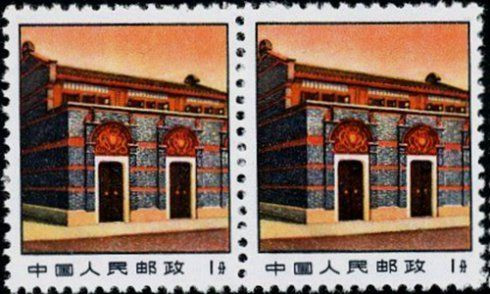 普14、普16第三、四版革命圣地圖案郵票,其中普14第一枚(1971年12月20日發行面值1分)、普16第二枚(1974年4月1日發行面值1.5分)的郵票圖案均為“中共一大會址”。這兩枚郵票中,構圖風格各有不同,普14是楊白子設計的,取房屋左側二扇門,在會址上空繪有一片黎明的霞光,輝煌燦爛,寓意“中共一大”召開的深遠歷史意義。普16是孫傳哲設計的,取用了石庫門樓房正面的全景,給人一種身臨其境的感覺。