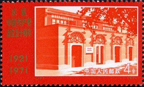 1969年10月1日,原郵電部發行了一套普通郵票,因在文革期間,故統稱“文普無編號郵票”,全套11枚。其中11-9是中共一大會址,由李大瑋設計,影寫版。圖案采用了“一大會址”的外景,按“文革”時突出的紅彤彤的色彩著色,在這座會址建筑物上空構出亂云飛渡,周圍簇擁著枝繁葉茂的樹木,象征著中共一大召開時的艱難政治形勢,寓意著中國共產黨成立。