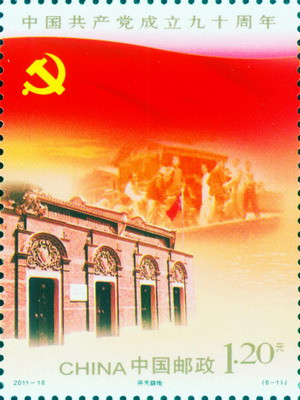 建黨90周年郵票:中國郵政于2011年6月22日發行《中國共產黨成立九十周年》紀念郵票1套6枚,小型張1枚。設計者:郝旭東。面值1.20元。