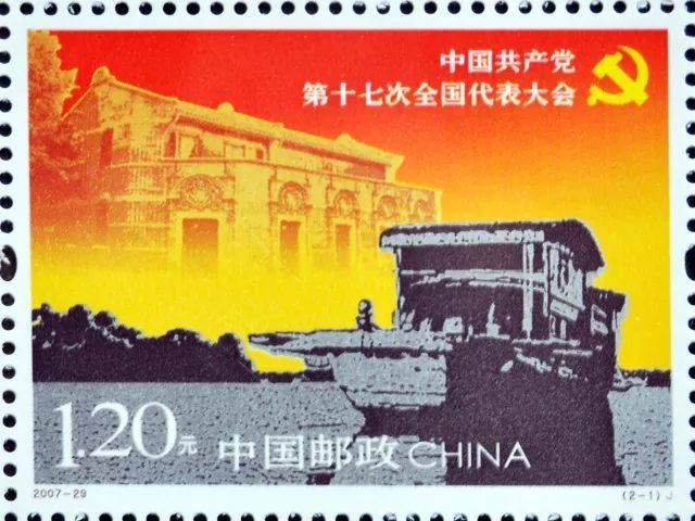 第三次:2007年10月15日,中國共產黨第十七次全國代表大會在北京召開,中國郵政發行《中國共產黨第十七次全國代表大會》紀念郵票一套2枚,“南湖紅船”與上海中共“一大”會址,并立設計在《中共“一大”會議會址》郵票上,這是“南湖紅船”第三次上國家郵票圖,票幅44X33毫米,陳幼林、王戈設計。