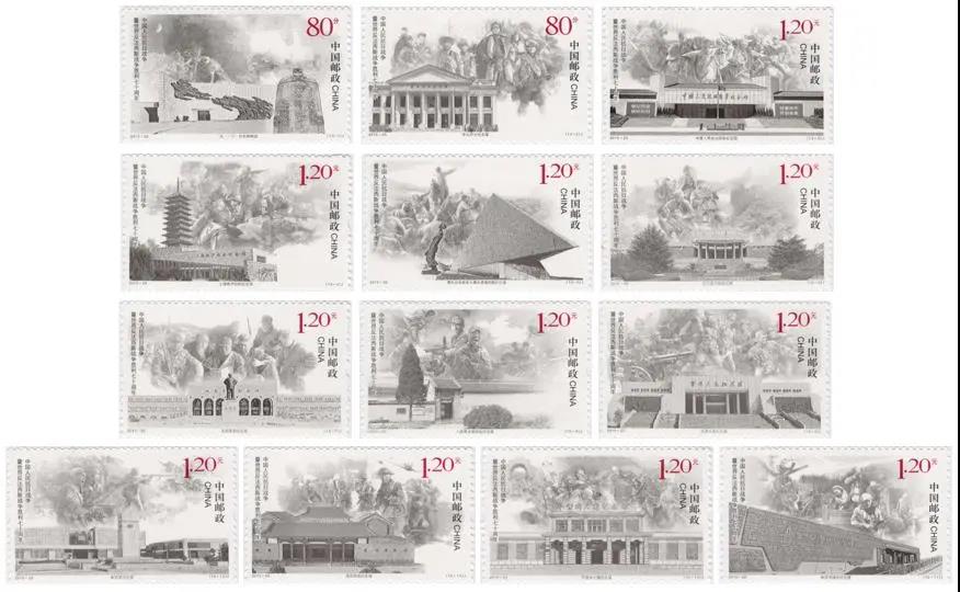 2015年9月3日上午,《中國人民抗日戰爭暨世界反法西斯戰爭勝利七十周年》紀念郵票首發式在西安市郵政公司舉行,本套郵票共13枚,小型張1枚。全套郵票面值為20.8元?!吨袊嗣窨谷諔馉庺呤澜绶捶ㄎ魉箲馉巹倮呤苣辍芳o念郵票,是我國歷次紀念抗戰勝利題材郵票當中發行枚數最多的一套。郵票內容分別為:1.“九一八”歷史博物館;2.東北烈士紀念館;3.中國人民抗日戰爭紀念館;4.上海淞滬抗戰紀念館;5.侵華日軍南京大屠殺遇難同胞紀念館;6.臺兒莊大戰紀念館;7.延安革命紀念館;8.八路軍總部舊址紀念館;9.百團大戰紀念館;10.平型關大捷紀念館;11.冉莊地道戰紀念館;12.新四軍紀念館;13.滇西抗戰紀念館。小型張畫面以《大刀進行曲》雕塑、長城、紅綢、和平鴿為主要元素,與中國人民抗日戰爭暨世界反法西斯戰爭勝利七十周年紀念活動標識相互呼應,融為一體。