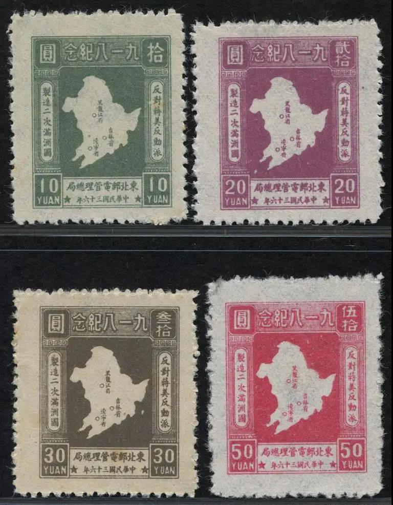 該套郵票一套4枚,圖案相同,就是刷色和面值各異。郵票的圖案主體為中國東北三省地圖,圖中明確標明三省省會的位置和各省名稱。圖案上方印刷郵票主題―“ 九一八紀念”,下方印刷“ 東北郵電管理總局★中華民國三十六年★”發行單位和發行時間,左右兩側印刷當時的口號“ 反對蔣美反動派,制造二次滿洲國”。這套郵票是由哈爾濱廣發印刷所承印,特別值得一提的是,該套郵票所用的紙張系為原偽滿洲國郵政局遺留庫存的水印絹絲紙,這也是“九一八事變”之后日本侵略者侵占了東北三省長達14年的證據之一(當時庫存之大,甚至到建國后,新中國發行的東普二也使用這款“ 水印紙 ”)。