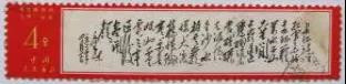 中國郵政曾經(jīng)發(fā)行的一套《毛主席詩詞》文革郵票,圖案均為毛澤東的詩詞手書。其中《毛主席詩詞》郵票第八枚《七律?長征》,是毛澤東在長征期間創(chuàng)作的最為經(jīng)典的一首,寫于1935年秋天,當時中央紅軍已走過最艱難的路程,即將與陜北紅軍勝利會師。全詩極其精煉地概括了紅軍長征的戰(zhàn)斗歷程,是紅軍長征的全面總結(jié),表現(xiàn)了紅軍的偉大形象和樂觀主義精神,展現(xiàn)了一幅雄偉壯麗的歷史畫卷。毛澤東的這首詩影響最大、傳播最廣。這首詩的手書還出現(xiàn)在2006年10月22日發(fā)行的《中國工農(nóng)紅軍長征勝利七十周年》紀念郵票小型張“大會師”的邊紙上。