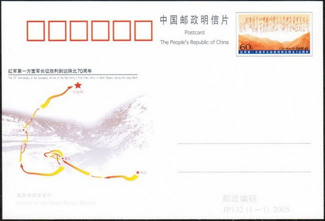 2005年10月19日,在紅一方面軍到達陜北吳起鎮(zhèn)70周年紀念日到來之際,國家郵政局曾發(fā)行JP132《紅軍第一方面軍長征勝利到達陜北70周年》紀念郵資明信片1套1枚,郵資片的郵資圖案為毛澤東的《七律?長征》詩,郵資片主圖為紅一方面軍長征路線簡圖,路線圖起點是瑞金,終點為陜北吳起鎮(zhèn)。這枚紀念郵資明信片的發(fā)行,從側(cè)面證實了長征題材第一套郵票,紀念的是紅一方面軍勝利完成二萬五千里長征二十周年。