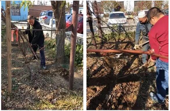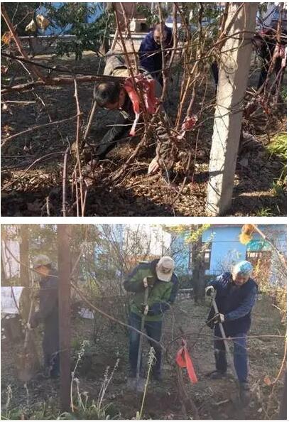 午餐過后,黨員和入黨積極分子們紛紛來到公司果園,積極參與為果園葡萄秧埋土防寒的活動中。在黨支部組織委員張勇清的帶領下,大家將修剪后的葡萄秧順其生長方向捆綁好,再用鐵鍬掘溝、挖好水渠。池塘中的水是最好的天然肥料,大家將池塘水引流至水渠,這樣既充分利用了水資源,又為葡萄秧添加了養分。本次黨員活動在歡快的氣氛中結束。