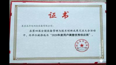 【企業(yè)動(dòng)態(tài)】您的滿意,我們的動(dòng)力!” 2020-09-282020年8月22日,秦皇島華電測(cè)控設(shè)備有限公司應(yīng)中國(guó)設(shè)備管理協(xié)會(huì)邀請(qǐng),參加2020年第四屆全國(guó)設(shè)備管理與技術(shù)創(chuàng)新成果交流大會(huì)。并被推薦為“2020年度用戶滿意優(yōu)秀供應(yīng)商”。 (華電測(cè)控獲獎(jiǎng)證書)(華電測(cè)控獲得2020年度用More